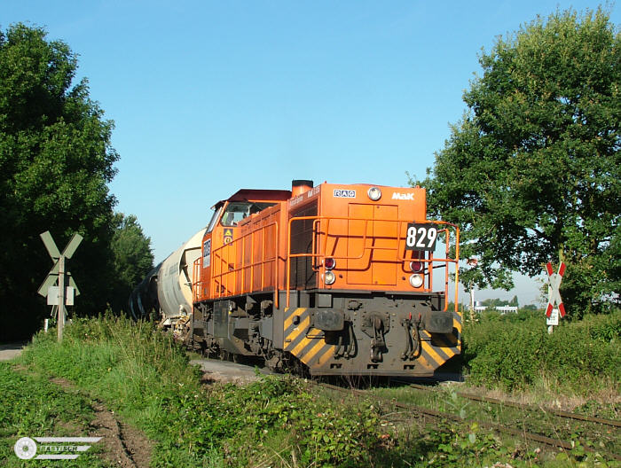 Erstmals gesichtet : Lok 829 RBH Logistics (ex RAG) am 13. Juli 2007 gegen 16:50 Uhr mit dem Kalksteinmehlzug der Neusser Eisenbahn bei km 1,5 von Rohdenhaus kommend