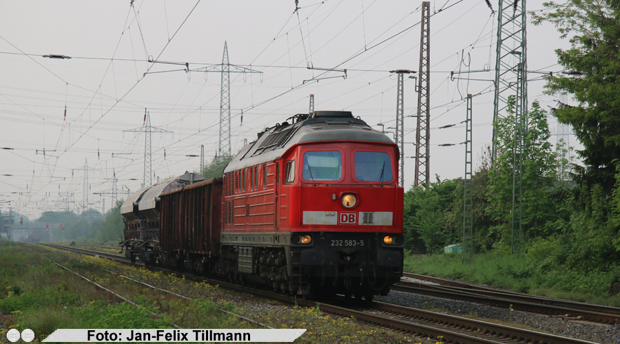 | Die Deutsche Bahn ist mit Lokomotiven der Baureihen 232 bzw. 247 (Montags bis Sonntags) vertreten. Ab dem 01.02.2014 kam die Baureihe 265 hinzu. | ||