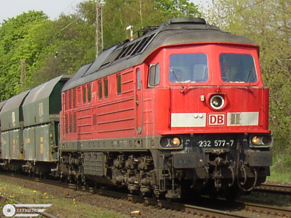 232 577 am 17. April 2004 bei der Ausfahrt Lintorf Richtung Angertal mit ihrem ausbelgischen und niederländischen Wagen bestehenden Zug
