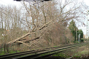 Am 18.01.2007 zog das Orkantief "Kyrill" über Deutschland hinweg. Gegen 17:30h wurde in Nordrhein-Westfalen der Schienenverkehr fast flächendeckend eingestellt. Der Personen- verkehr kam teilweise am 19.01.2007 wieder ans Laufen. Auf der Güterzugstrecke Duisburg-Düsseldorf herrschte jedoch noch "Zwangsbetriebsruhe". links: 19.01.2007 Baum bei km 14,4 rechts: 19.01.2007 294 857 übernachtete in Ratingen West Link zu grösseren und weiteren Aufnahmen ( Netz Instandhaltung bei der Beseitigung des Baumes am 20.01.2007) |
