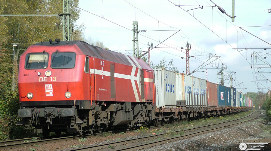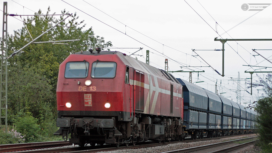| DE 13 am 22.Juli 2008 Lz durch Lintorf Richtung Duisburg. Eine Woche später musste die Lok, die letzte ihrer Bauart, angeblich mit einem Motorschaden abgestellt werden (am 3.August 2008 wieder in Lintorf gesichtet). |