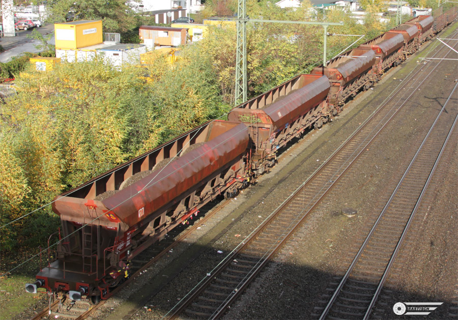 Abgestellt in Düsseldorf-Rath für zukünftige Schienenerneuerungen - Langschienentransporteinheit von ThyssenKrupp