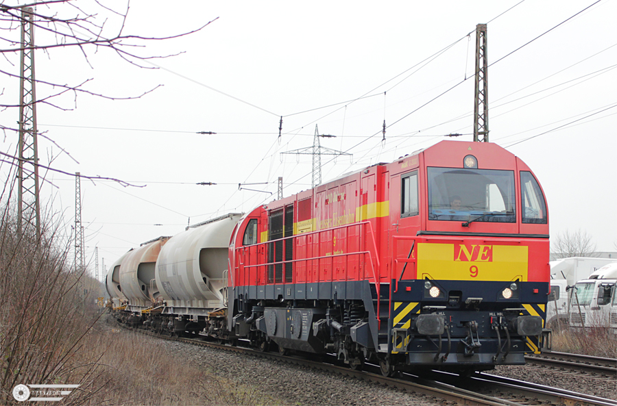 10:21 Uhr - Lok 9 der Neusser Eisenbahn noch auf der Gleis der Angertalbahn mit Kalkzug an der Abzweigstelle Tiefenbroich
