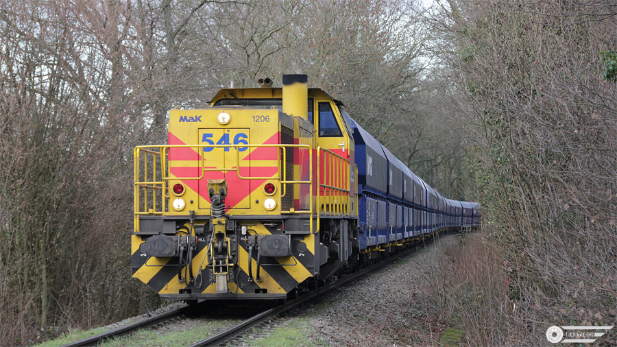 15:45 Uhr - ThyssenKrupp Lok 546 mit Kalkzug vor km 11,0